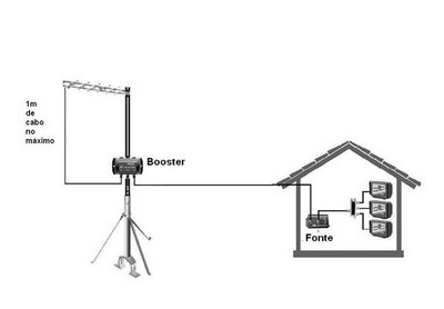O booster deve ser colocado no mastro, proximo a antena como mostra o gráfico acima, use no máximo 1 mt. de cabo. A fonte deve ser instalada proxima a TV, ela sera ligada numa tomada de 127 ou 220 v. caso utilize um divisor para mais de uma TV. coloque-o depois da fonte.