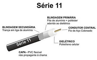 Condutor central de aço, revestido de cobre; dielétrico de polietileno expandido por gás; blindagem interna de folha laminada de alumínio-polipropileno-aluminio sobreposta e aderida ao dielétrico; blindagem externa de fios nus de alumínio trançado, jaqueta de policloreto de vinila ou polietileno (PVC), fabricados no Brasil.